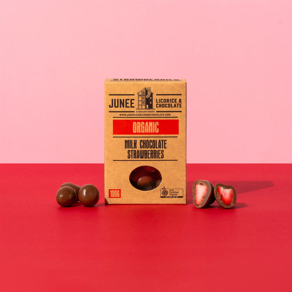 Freeze dried strawberries coated in organic couverture milk chocolate